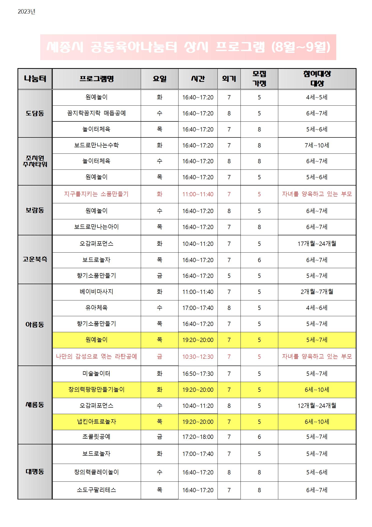 세종특별자치시 공동육아나눔터 8~9월 프로그램 참여 모집 안내입니다.