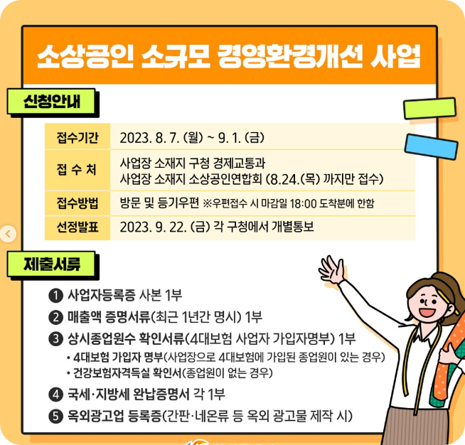 - 접수처 : 사업장 소재지 구청 경제교통과 / 소상공인연합회(8.24.까지만 접수)